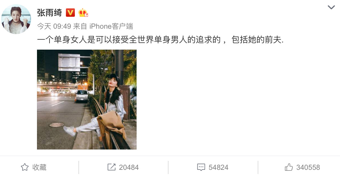 “一个单身女人是可以接受全世界单身男人的追求的,包括她的前夫。”